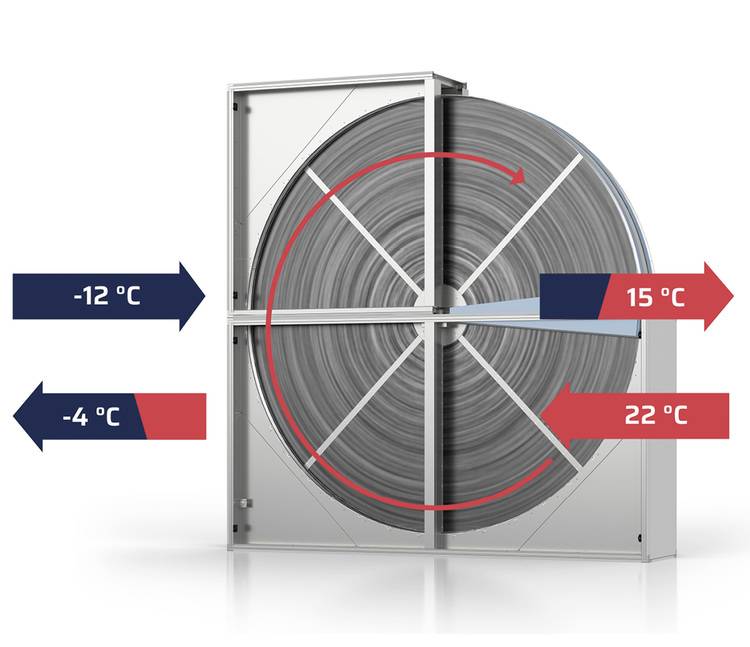 - Rotationswärmeübertrager: Für die Wärmerückgewinnung wurde ein effizient arbeitender Rotationswärmeübertrager mit niedriger Leckage-Rate gewählt. Das Dichtsystem wird nicht - wie üblich - seitlich an den Rotor herangeführt, sondern die Dichtung rotiert mit dem Rotor. Mehrere Dichtlamellen sind an der Wandung befestigt und erzielen zusammen mit dem rotierenden Teil eine hohe Dichtigkeit. Die jeweils doppelt, auf An- und Abströmseite montierten Zentraldichtungen sind in mehrstufiger Kaskade als Labyrinthdichtung ausgeführt.