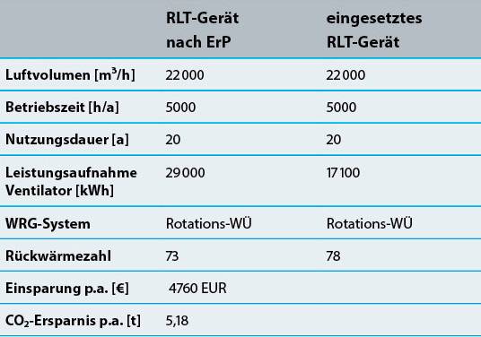 Die Wärmerückgewinnung des oben beschriebenen Gerätes beträgt 116 kW (nach ErP müsste das Gerät 108,6 kW erfüllen) bzw. die Rückwärmezahl liegt bei 78 Prozent (statt 73 Prozent). Damit werden 7,9 Prozent bzw. 8,2 kW Einsparung gegenüber ErP erreicht.