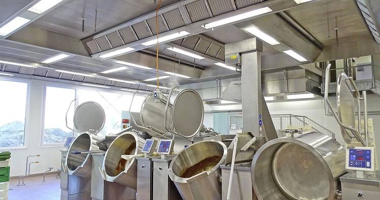 Ein Fallbeispiel: Die Universität Leipzig unterhält mehrere Mensen. Sie beziehen ihre Mahlzeiten von einer Zentralküche, die weitgehend vernetzt ist. Kochgeräte, Spülroboter und Lüftungsanlagen arbeiten nahezu autark. Auf einer Fläche von 1.270 m2 werden täglich 10.000 Mittagessen für Studierende und 10.000 Mahlzeiten für die Außer-Haus-Verpflegung zubereitet. Bei voller Last beträgt die Abluftmenge 55.000 m3/h (Bild oben).