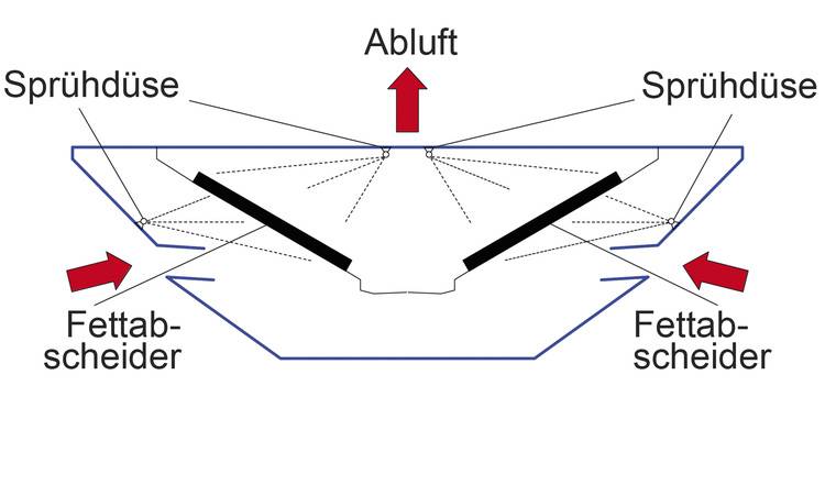Bei modernen Löschsystemen sind die Sprühdüsen für das Löschmittel unterhalb der Fettabscheider auf einer Löschbrücke installiert, ähnlich wie bei einer Sprinkleranlage. Der Löschvorgang wird automatisch durch ein Schmelzlot oder von Hand ausgelöst. Serviceleiter Kiss rät: „Im Brandfall sollte wie bei der Waschautomatik auch der Abluftbereich hinter den Fettabscheidern besprüht werden, damit die Brandübertragung auf angrenzende Gebäudezonen vermieden wird.“ Mit dem Löschvorgang muss außer der Lüftung auch die Strom- bzw. Gasversorgung der Kochgeräte selbsttätig unterbrochen werden.