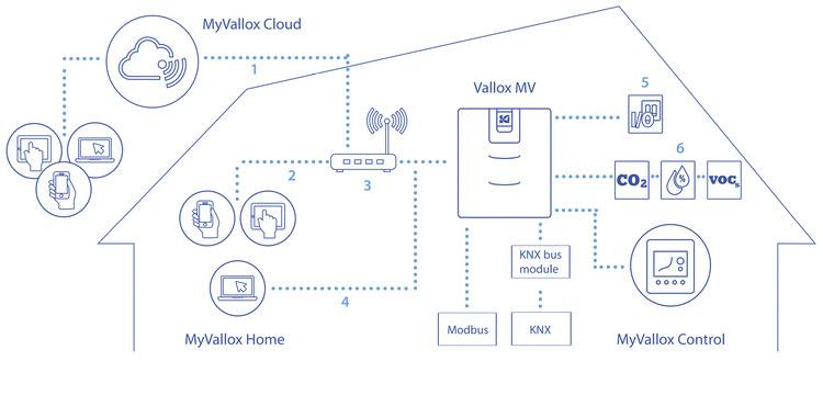Die Abkürzung MV bei der Geräteserie wiederum steht für die Steuerung MyValloxControl. Diese Smart-Home Steuerung verfügt über diverse Möglichkeiten und funktioniert über Internet / LAN /WLAN / KNX / Modbus. Als Ergänzung zum Bedienelement MV-C80 benötigt der Anwender lediglich ein Endgerät wie ein Smartphone, Tablet oder PC.