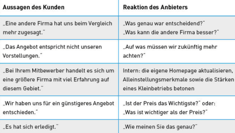 Gründe für den Auftragsverlust sollte man hinterfragen, das zeigt Interesse am Kunden und ist eine Chance, es zukünftig besser zu machen. Es ist eine Frage, wer die Absage erteilt: Stamm- oder Neukunde, Gewerbe- oder Privatkunde. Gewerbekunden mit größerem Einfluss überlässt man nicht gerne dem Wettbewerb. Viele Anbieter wollen gar nicht wissen, was Kunden missfällt, sie haben weder Lust noch Zeit, sich damit zu beschäftigen. Und warum sollte man Kunden hinterherlaufen? Haben wir nicht Kunden genug?