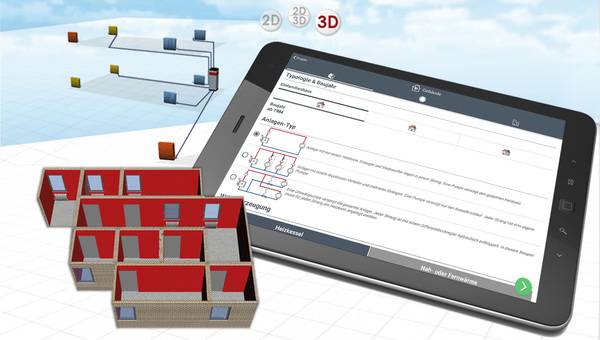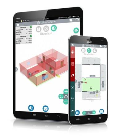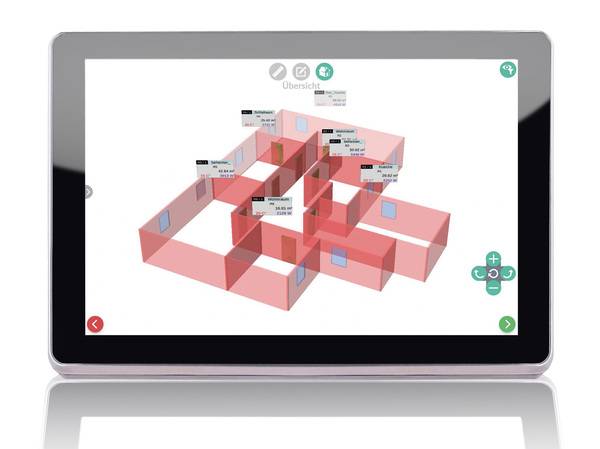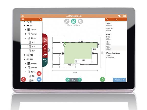 Die Basis: die bimCAD App zur effizienten Gebäudeerfassung als Grundlage im BIM-basierten Planungsprozess. In wenigen Schritten erstellt der Anwender auf seinem Tablet oder Smartphone raumweise den Gebäudegrundriss mit Bauteilen, Heizkörpern, Öffnungen wie Fenster oder Türen und weiteren Definitionen. Durch simples Aufziehen von Räumen in verschiedenen Größen und mit individuellen Maßeingaben entstehen selbst große Gebäude kinderleicht. Integrierte Assistenten für U-Werte, Raumtemperaturen, Anlagenbauteile etc. ermöglichen die weitere Verfeinerung der Datenaufnahme. Parallel zum 2D-Gebäudegrundriss können die Eingaben in einem einfachen 3D-Modell überprüft werden.
