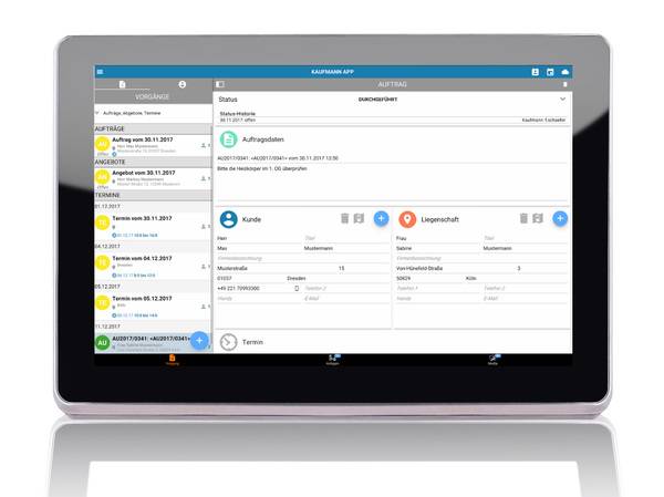 Bei Ausführung und Abrechnung kommen die kaufmännischen mobilen Lösungen zum Zug. Mit der Kundendienst-App lassen sich Service-Aufträge in Verbindung mit dem Wartungsmodul abwickeln und abrechnen, die Zeiterfassungs-App spart im Zusammenspiel mit der Branchensoftware Kaufmann 4.0 Zeit und Geld durch gezielte Stundenerfassung. Die täglichen kaufmännischen Anforderungen, wie z.B. der GoBD, werden durch die mobilen Andwendungen somit vereinfacht. Der Datenaustausch mit den Desktop-Anwendungen erfolgt mittels sicherer Datenübertragung (Cloudservice).