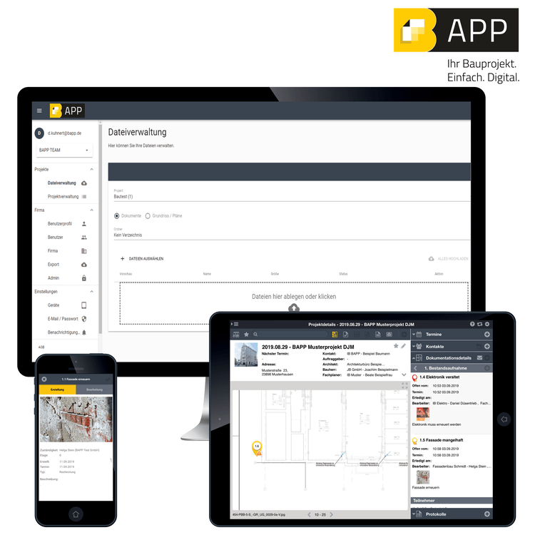 Die Zahl an Bauprojekten ist in den vergangenen Monaten rasant gestiegen. Der Druck, Informationen zu liefern und gleichzeitig alles zu erfassen, wird immer größer. Mit Bapp können Bauprojekte unterschiedlichster Dimensionen begleitet oder geleitet werden. Es entsteht eine plattformunabhängige Dokumentation, die auch Jahre nach Bauabschluss einen hohen Informationsgehalt hat. Außerdem entfällt die zeitaufwendige Nacharbeit, da alles direkt vor Ort erledigt werden kann.