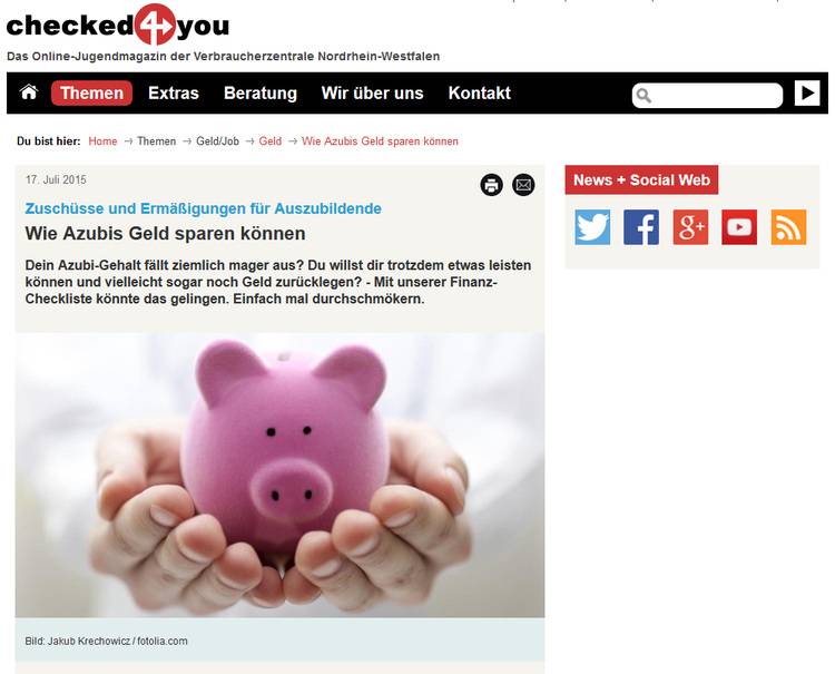 Die Verbraucherzentrale NRW spricht mit dem Online-Magazin checked4you insbesondere Themen für jüngere Menschen an. Vor allem Azubis bekommen hier Tipps, wie sie Geld während der Lehre sparen können. Von Fahrkosten und Mietzuschuss bis Ermäßigungen und Rabatte – die Internetseite stellt nützliche Tipps und Links bereit.