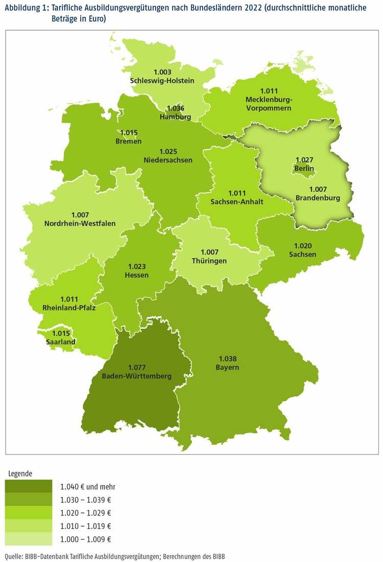 Betrachtet man die durchschnittlichen tariflichen Ausbildungsvergütungen nach Bundesländern, zeigen sich ebenfalls zum Teil deutliche Differenzen. In allen Bundesländern lag der Vergütungsdurchschnitt aber 2022 über 1.000 Euro. 2021 traf dies mit Bremen und Baden-Württemberg nur auf zwei Länder zu. Schleswig-Holstein hatte mit 1.003 Euro den niedrigsten Vergütungsdurchschnitt, Baden-Württemberg liegt mit 1.077 Euro mit Abstand an der Spitze.