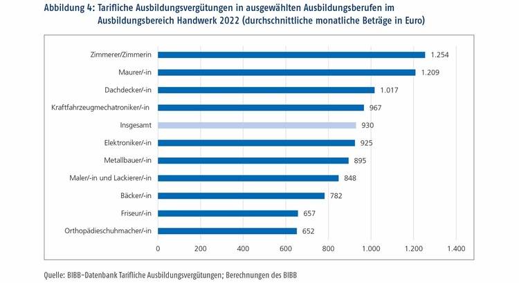 Dabei ist im Handwerk das Gefälle bei den tariflichen Ausbildungsvergütungen besonders groß. In zwölf Berufen wurden tarifliche Ausbildungsvergütungen von im Durchschnitt mehr als 1.000 Euro gezahlt. In sieben dieser Berufe, die alle zum Baubereich gehören, lagen sie sogar bei um die 1.200 Euro oder mehr. Dies waren: