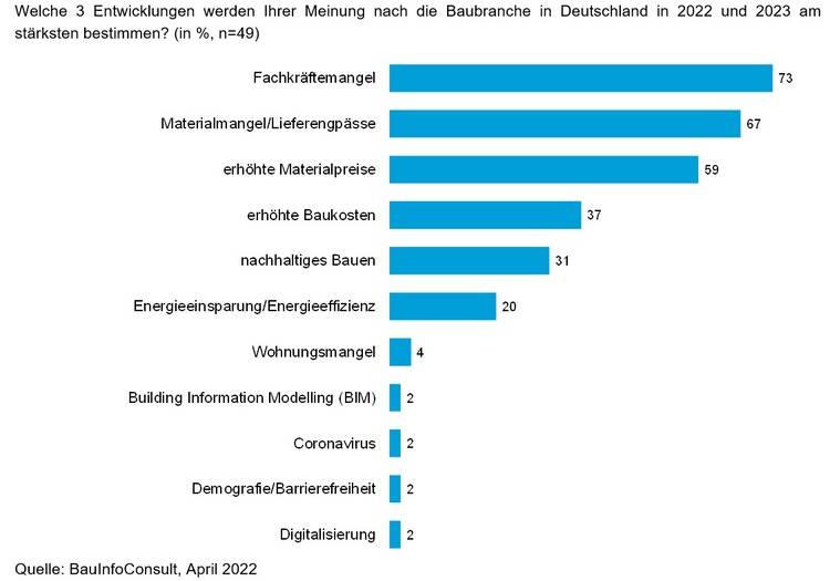 Welche 3 Entwicklungen werden Ihrer Meinung nach die Baubranche in Deutschland in 2022 und 2023 am stärksten bestimmen? (in %, n=49)
