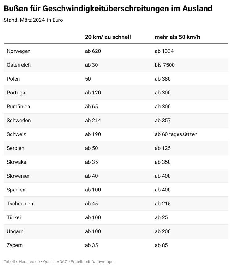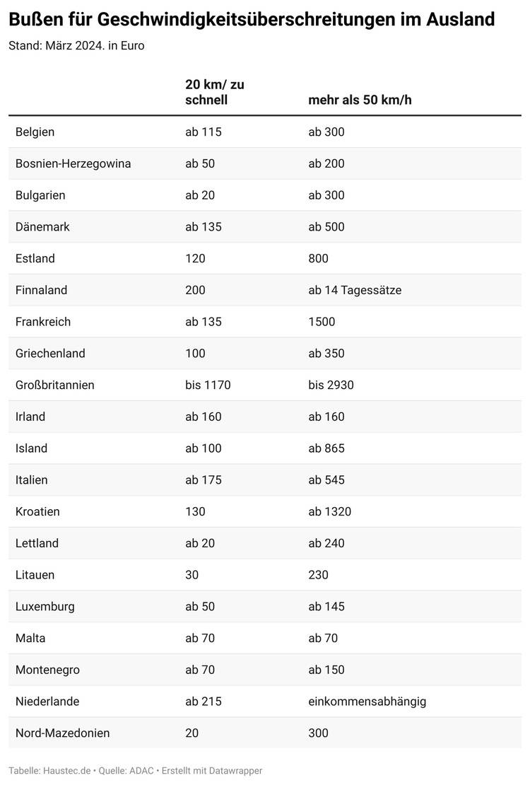 Bei den Bußgeldern liegt Deutschland in der oberen Hälfte. Ausreißer nach oben ist Großbritannien, wo es eine Geldbuße in unbegrenzter Höhe gibt. Auch Dänemark mit einem Nettomonatsverdienst kann teuer werden. Mit hohen Einkommen ist man zudem in Finnland und Schweden schlecht dran: 14 bzw. 40 Tagessätze sind die Untergrenze!