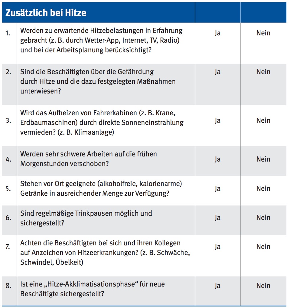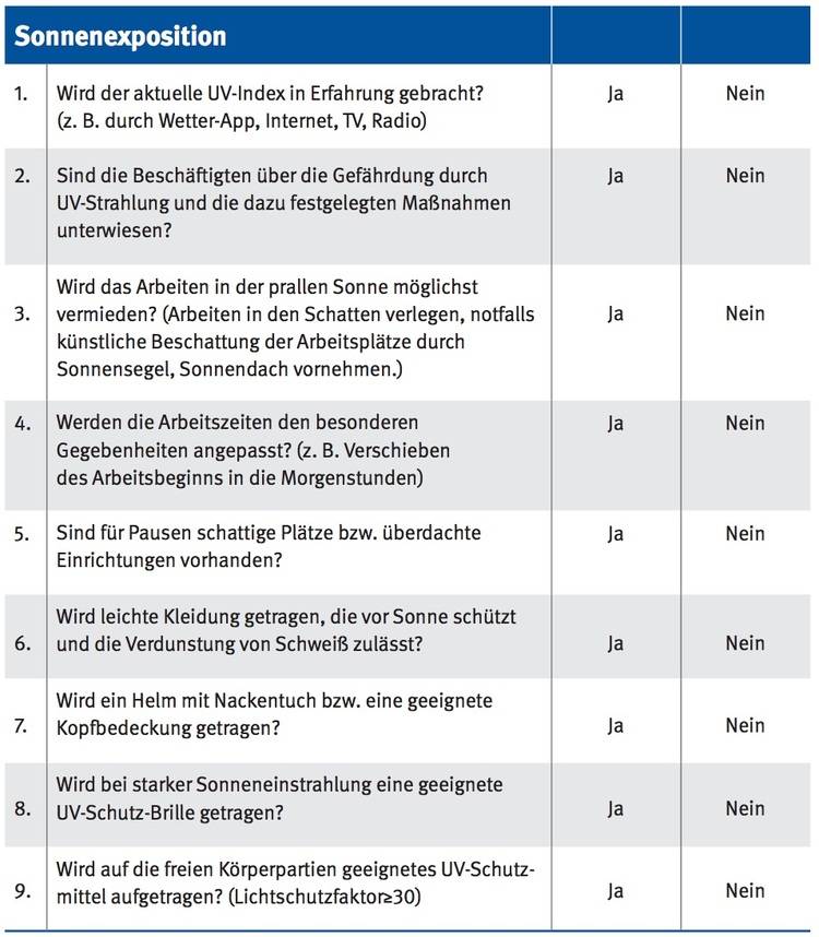 Die umstrittene Sonnenschein-Richtlinie ist noch nicht in Kraft. Dennoch weisen die Berufsgenossenschaften darauf hin, dass die aktuelle Sommerliche Witterung in weiten Teilen Deutschlands zusätzliche Risiken mit sich bringt.