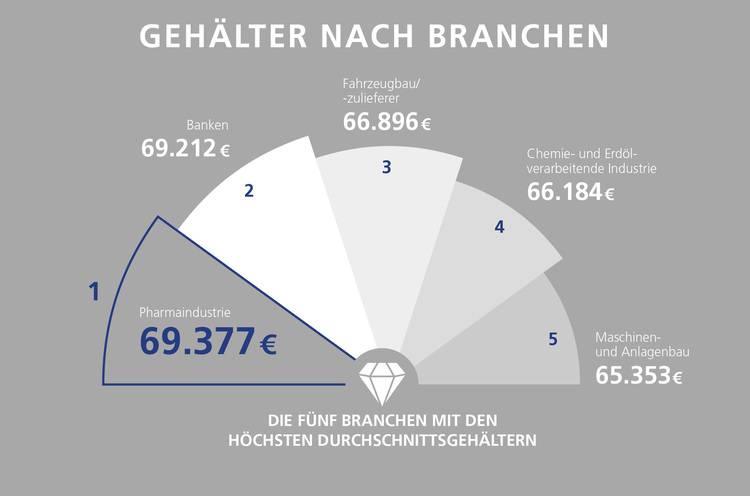 Das Spitzentrio der Branchen mit den höchsten Gehältern bilden die Pharmaindustrie (69.380 Euro), Banken (69.210 Euro) sowie die Autoindustrie (66.900 Euro).