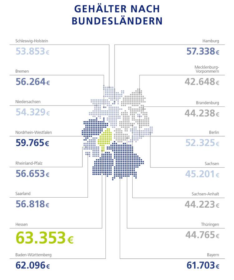 - Im Vergleich der Bundesländer sichert sich Hessen wie schon in den vergangenen Jahren Rang 1 (63.350 Euro). Auf Platz 2 und 3 liegen mit nur geringem Abstand voneinander Baden-Württemberg (62.100 Euro) und Bayern (61.700 Euro).