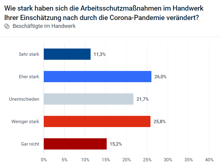 Auf die Frage, wie stark sich die Arbeitsschutzmaßnahmen im Handwerk durch die Corona-Pandemie verändert haben, fielen die Ergebnisse auffallend unterschiedlich aus: Während 37,3 % der Befragten fanden, dass sich die Schutzmaßnahmen sehr stark (11,3 %) bis eher stark (26 %) verändert hatten, waren 41 % der Ansicht, dass es in diesem Punkt weniger starke (25,8 %) oder gar keine (15,2 %) Veränderungen gegeben hat.