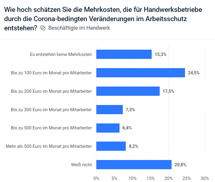 Bei den Kosten, die jedes Unternehmen aktuell aufgrund der zusätzlich nötigen Schutzmaßnahmen stemmen muss, ist das Stimmungsbild unter den Befragten recht breit gefächert: 15,3 % der im Handwerk Beschäftigten geben an, dass keine zusätzlichen Kosten entstehen, während auf der anderen Seite 8,2 % der Befragten zusätzliche Kosten in Höhe von mehr als 500 Euro pro Monat und Mitarbeiter nennen.