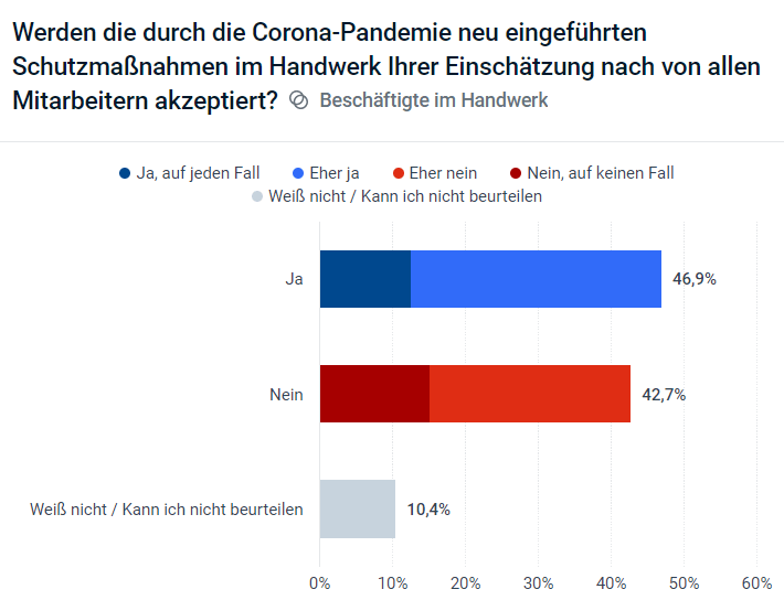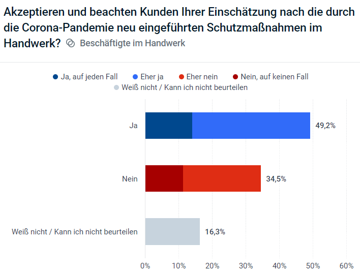 Auch zur Akzeptanz der Kunden hinsichtlich der Corona-Schutzmaßnahmen wurden die im Handwerk Beschäftigten befragt: 49,2 % geben an, dass die Maßnahmen von den Kunden akzeptiert werden. 14 % antworteten mit "Ja, auf jeden Fall", 35,2 % mit "eher ja".