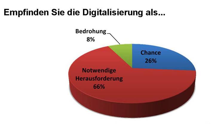 Insgesamt antwortete knapp die Hälfte der Befragten, dass sie bereits Schritte eingeleitet habe, digitale Geschäftsprozesse einzuführen. Mehr als die Hälfte (55%) plant, in Zukunft Investitionen in die Digitalisierung des eigenen Unternehmens zu tätigen. Hierbei wird der durchschnittliche Investitionsbedarf mit ca. 21.000 Euro pro Betrieb für die nächsten drei Jahre angegeben. Ein gutes Viertel der Betriebe empfindet die Digitalisierung als Chance, Zweidrittel nehmen die Herausforderung notwendiger Weise an. Weniger als 10% empfinden die fortschreitende Digitalisierung für ihren Betrieb als Bedrohung.