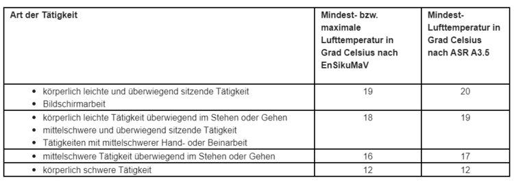 Für Arbeitsräume in öffentlichen Gebäuden gelten dagegen Höchstwerte: Büros dürfen nur noch auf maximal 19 Grad Celsius geheizt werden. Eine entsprechende Absenkung der Lufttemperatur gilt auch für andere Arbeitsräume in öffentlichen Nichtwohngebäuden (s. Tab. 1).