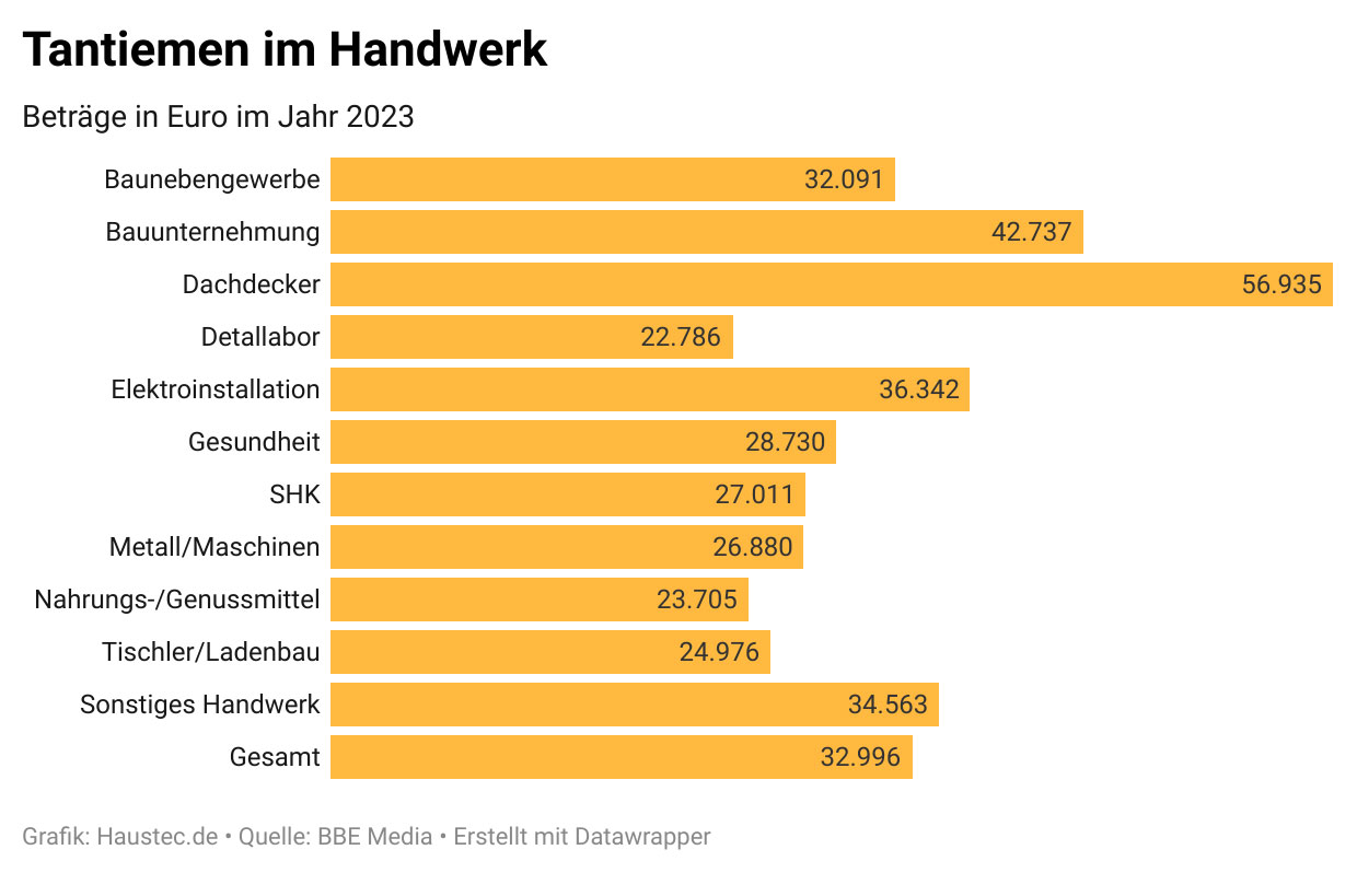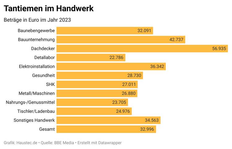 Tantiemen spielen im Handwerk eine große Rolle - sie sind ein wesentlicher Bestandteil der Gehälter von GmbH-Geschäftsführern und Geschäftsführerinnen. Dachdecker schneiden dabei am besten ab, sie erhalten im Durchschnitt rund 57.000 Euro Tantiemen. Am wenigsten zahlen Dentallabore und die Nahrungs- und Genussmittelbranche.