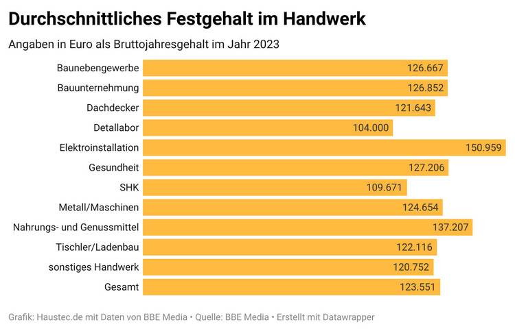 Der Gesamtdurchschnitt über alle Branchen liegt bei knapp 33.000 Euro pro Jahr. Über diesem Betrag liegen neben den Dachdeckern nur die Elektroinstallateure, Bauunternehmer sowie das "sonstige Handwerk". Das SHK-Handwerk liegt mit 27.000 Euro darunter.