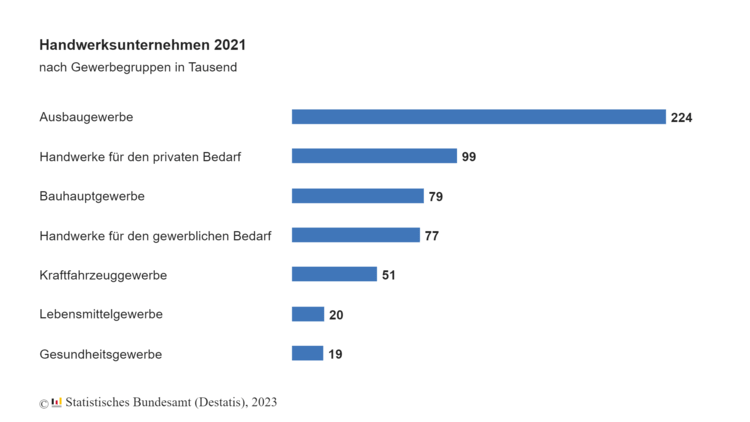Die weitaus größte Gewerbegruppe innerhalb des Handwerks bezogen auf die Zahl der Unternehmen, die tätigen Personen sowie den Umsatz ist das Ausbaugewerbe. Es umfasst nach der Novellierung der Handwerksordnung im Jahr 2020 nur noch zulassungspflichtige Gewerbezweige wie beispielsweise Installation und Heizungsbau, Malerei und Lackiererei, Tischlerei sowie Elektrotechnik. Im Jahr 2021 erwirtschafteten die 224.000 Handwerksunternehmen im Ausbaugewerbe mit 1,5 Millionen tätigen Personen 187 Milliarden Euro Umsatz. Damit fiel die Zahl der Unternehmen im Ausbaugewerbe um 1,3 % gegenüber dem Vorjahr, während die Zahl der tätigen Personen um 0,1 % stieg und der Umsatz um 2,2 % zunahm.