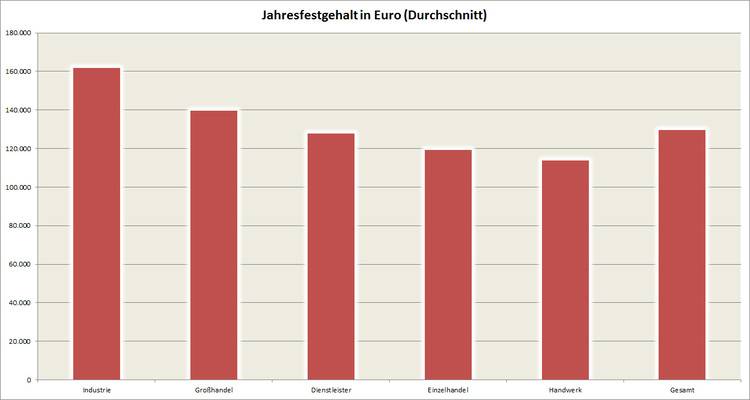 Die Studie gibt ebenfalls Auskunft über das jährliche Festgehalt in den einzelnen Wirtschaftszweigen bzw. Branchen. Darin enthalten sind Tantiemen, jedoch keine sonstigen Zusatzleistungen oder Sonderzahlungen.