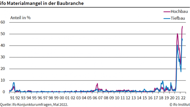 "Die Materialpreise legen infolge der Knappheit und höheren Energiekosten weiter zu. Aufgrund der steigenden Baukosten und der höheren Zinsen kommt es nun besonders im Wohnungsbau vermehrt zu Auftragsstornierungen", sagt ifo-Forscher Felix Leiss. Im Hochbau lag der Anteil der Unternehmen, die Knappheit meldeten, im Mai bei 56,6 Prozent, nach 54,2 Prozent im Vormonat. Im Tiefbau wurden 44,8 Prozent ermittelt. Von diesen Unternehmen berichteten wiederum 91,1 Prozent, dass der Krieg in der Ukraine die Materialengpässe verschärft habe.