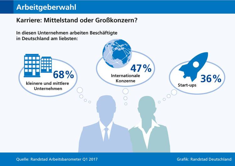 Diese Frage stellt sich für viele Arbeitnehmer, wenn sie sich bewerben. Kleine und mittlere Unternehmen (KMU) haben bei der Jobwahl deutlich die Nase vorn. 68 Prozent der Beschäftigten bevorzugen dort zu arbeiten, so das Ergebnis des aktuellen Randstad Arbeitsbarometers. Auf Platz 2 folgen internationale Konzerne (47 Prozent) und auf Platz 3 Start-ups (36 Prozent).