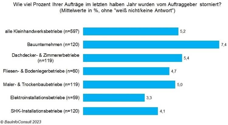 Das Kleinhandwerk stellt fast zwei Drittel der Unternehmen am Bau. Eine aktuelle, repräsentative Umfrage von BauInfoConsult unter Baufirmen mit weniger als fünf Mitarbeitern, zeigt ein besseres Bild der Auftragslage als bei größeren Betrieben. Im Schnitt wurden die kleinen und Kleinstunternehmen am Bau in den letzten sechs Monaten nur von 5,2 Prozent ihrer Auftraggeber versetzt.