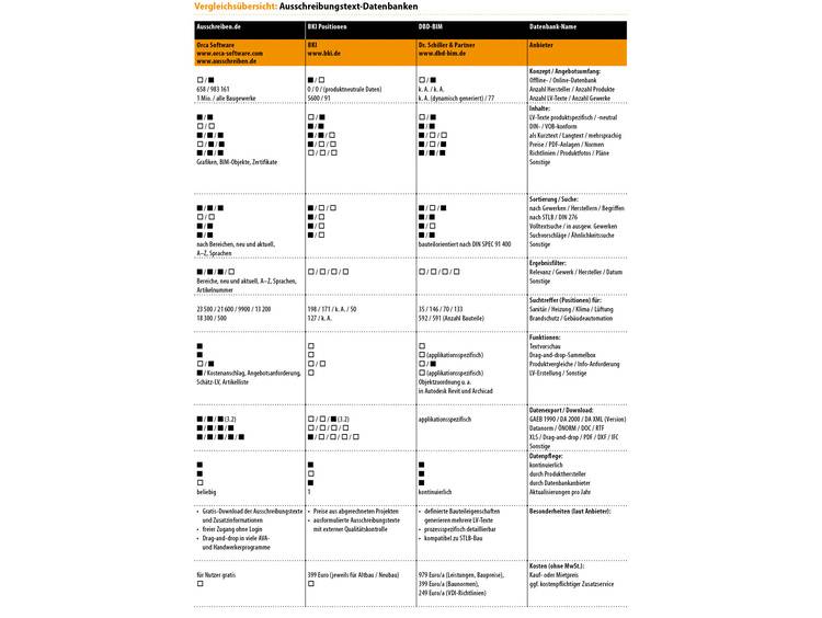 - Diese frei zugängliche Online-Datenbank von Orca Software bietet rund 1 Mio. Leistungsbeschreibungen von Produktherstellern aus unterschiedlichen Gewerken sowie herstellerneutrale DIN- und VOB-gerechte Texte zum kostenlosen Download.