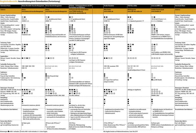 Die weitere Frage ist deshalb, ob der Angebotsschwerpunkt auf produktspezifischen Angebotstexten liegt (z. B. www.ausschreiben.de), oder ob ausschließlich produktneutrale Ausschreibungstexte offeriert werden (z. B. BKI, Heinze Ausschreibungstexte online, Sirados Baudaten, STLB Bau online).