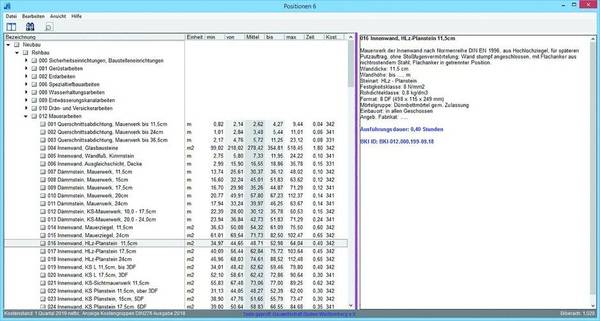 - Die Daten sind übersichtlich strukturiert und enthalten marktrecherchierte Baupreise, Zeitwerte, Skizzen und Kostengruppen nach DIN 276. Die Daten lassen sich per GAEB-, Datanorm-, ÖNORM-, und weitere Schnittstellen importieren.