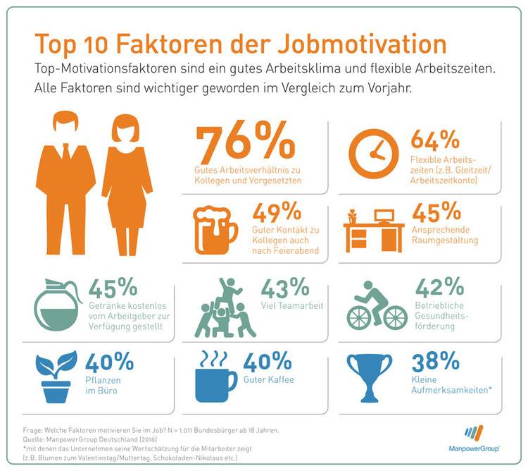 Die gute Nachricht: Arbeitgeber können eine Menge tun, damit sich ihre Belegschaft wohl fühlt. Was das ist, hat jetzt eine Studie herausgefunden. Das Fazit: Nette Kollegen und Vorgesetzte sind den Deutschen im Job am wichtigsten. 76 Prozent der Arbeitnehmer haben mehr Freude an ihrer Arbeit, wenn der menschliche Faktor stimmt. Dagegen spornen flexible Arbeitszeiten nur noch jeden zweiten Mitarbeiter an. Zu diesen Ergebnissen kommt die Studie „Arbeitsmotivation 2016“ der Manpower Group.