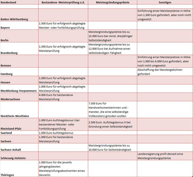 Doch die Meisterprämie, der Meisterbonus oder das Meister-Extra sind Förderungen der Länder. So gibt es in einigen Ländern Prämien für erfolgreich bestandene Meisterprüfungen, andere Länder bezuschussen die Gründung einer selbstständigen Tätigkeit mit Fördermitteln. Dabei sind die Höhe des Geldes und die Voraussetzungen nicht immer dieselben. Einige Länder haben kaum Maßnahmen, um den Meister-Titel attraktiver zu machen. Wer wie viel fördert, zeigt unsere Tabelle:
