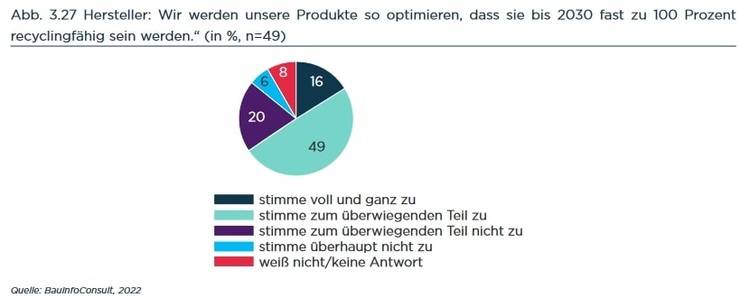 Dass den meisten Unternehmen bewusst ist, dass das Thema grüne Bauwirtschaft nicht ignoriert werden kann, spiegelt sich auch in den Plänen vieler Firmen wider: So planen zwei Drittel der Hersteller ihre eigenen Produkte dahingehend zu optimieren, dass diese bis spätestens 2030 zu fast 100 Prozent recyclebar sein werden.