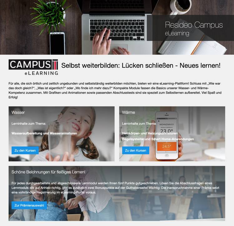 Normen ändern sich, technische Entwicklungen schreiten voran, Wissen rostet ein: Um den beruflichen Anforderungen des SHK-Installateurs jederzeit gerecht zu werden, ist es wichtig, den Anschluss nicht zu verpassen. Weiterbildung ist in unterschiedlichen Formen möglich – abhängig von den persönlichen Lernpräferenzen und den Rahmenbedingungen. Resideo unterstützt Installateure schon seit vielen Jahren durch ein vielfältiges Fortbildungsangebot. Dazu zählen die bekannten praxisnahen Fachseminare und die einstündigen Webinare zu topaktuellen Branchenthemen. Ganz aktuell ergänzt Resideo für die einfache Vermittlung von Installationsgrundlagen eine eLearning-Plattform mit kompakten Lernmodulen. So ergibt sich insgesamt ein attraktives Weiterbildungs-Trio für Wasser- und Wärmethemen, welches im Resideo Campus (campus-resideo.de) gebündelt wird. Mit diesem möchte der Wasser- und Wärmeexperte künftig jedem Lerntyp und Wissenstand entgegenkommen.