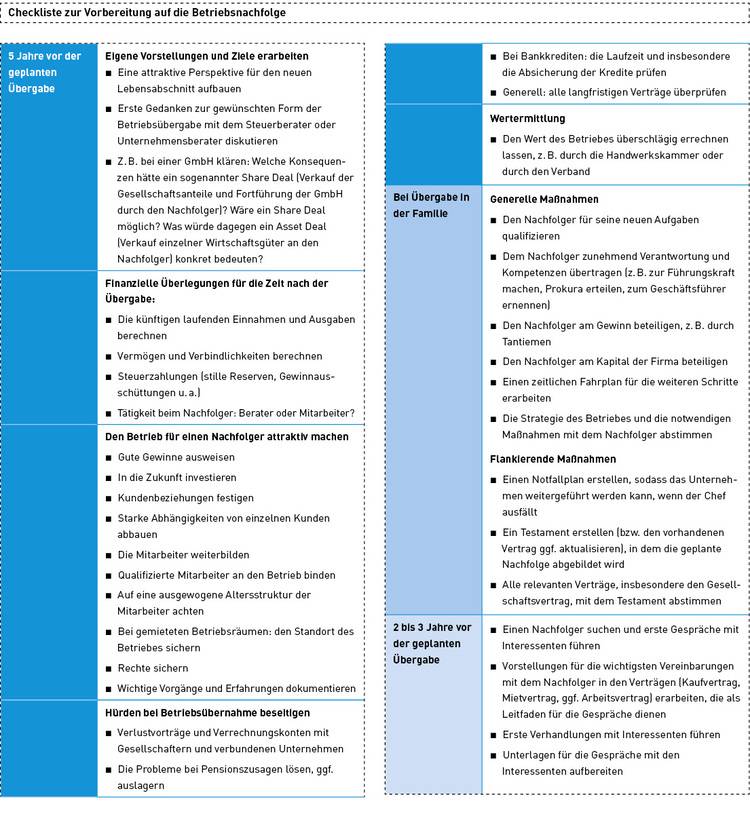 Zu wenig sind sich Handwerksunternehmer bewusst, dass sich das Aufgabenfeld des Nachfolgers nach der erfolgten Übergabe gravierend verändert. Solange der Senior am Ruder steht, nimmt er seine Führungsaufgaben wahr. Der Junior dagegen steht meistens in der zweiten Reihe, in der Werkstatt oder auf der Baustelle. Nach der Übernahme muss er sich aber primär um die Kunden, die Aufträge, die Mitarbeiter und die Organisation kümmern. Da sind seine Fähigkeiten als Unternehmer und als Chef gefragt. Wenn er in dieser Position noch Lehrgeld bezahlen muss, kommt es den Betrieb teuer zu stehen.