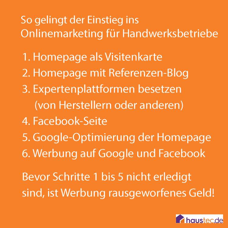 Zur Relativierung meiner Aussage: Ich wäre schon mal glücklich, wenn jeder gute Handwerksbetrieb eine tolle Homepage als Visitenkarte im Netz hätte. Das ist der zentrale Anlaufpunkt für die Kunden. Selbst wenn ich nur von Weiterempfehlungen lebe, so rufen doch heute die Kunden nicht einfach sofort bei dem empfohlenen Betrieb an. Sie schauen erst mal im Netz, ob der Laden wirklich taugt. Was ihn da häufig erwartet, ist alles andere als vertrauenerweckend.