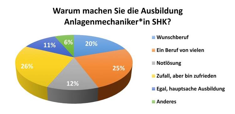 Erstens zeigt sich, dass Jugendliche bereit sind für den neuen Lebensabschnitt Ausbildung. Sie müssen jedoch durch geeignete Maßnahmen zu Beginn der Ausbildung in die Betriebe integriert werden. Anlagenmechaniker SHK ist nämlich für nur 20 % der Jugendlichen ein Wunschberuf. Die Mehrzahl ist da überraschend reingekommen. 12 % sehen den Beruf lediglich als Notlösung. Es gilt in jedem Fall, die Jugendlichen in ihrer Wahl des Ausbildungsberufs zu bestärken und die vielfältigen Perspektiven aufzuzeigen.