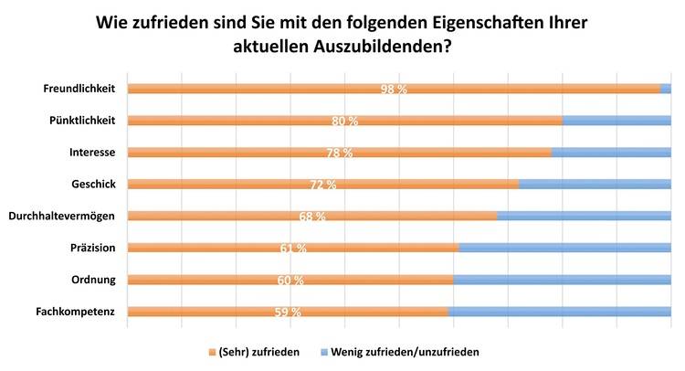 Ausbildungsbetriebe sind weniger zufrieden bei wichtigen Eigenschaften von Azubis, u. a. Fachkompetenz und Durchhaltevermögen. Deshalb gilt: Der Erwerb von zusätzlichem Know-how ist für alle an der Ausbildung Beteiligten wichtig.