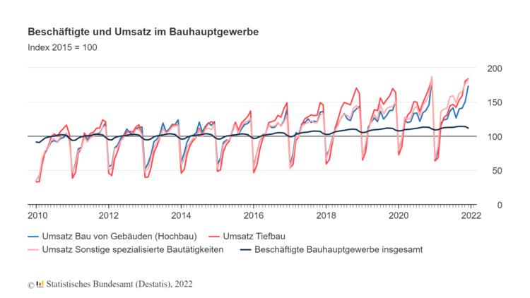 Wie das Statistische Bundesamt (Destatis) nach vorläufigen Ergebnissen weiter mitteilt, stieg die Zahl der Beschäftigten gegenüber dem Vorjahr um 1,4 %. Die größten Umsatzsteigerungen innerhalb des gesamten Bauhauptgewerbes konnten die Wirtschaftszweige Zimmerei mit +6,4 % und „Sonstige spezialisierte Bautätigkeiten anderweitig nicht genannt“, zu denen unter anderem Betonarbeiten zählen, mit +9,1 % verzeichnen. Der Rohrleitungstiefbau und Kläranlagenbau verbuchte dagegen mit -5,7 % einen Umsatzrückgang.