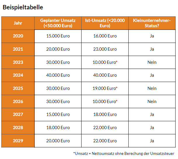 Ein Handwerker hat sein Unternehmen am 1. Januar 2020 gegründet und erzielt einen Umsatz von 18.400 Euro für das Kalenderjahr. Im Jahr 2021 beträgt der Umsatz 40.000 Euro. Damit liegt er in den Grenzen und darf die Kleinunternehmerregelung für sich in Anspruch nehmen. Gründet er sein Unternehmen erst im Mai 2020 darf er maximal 14.666,66 Euro umsetzen (=8/12 von 22.000 Euro).