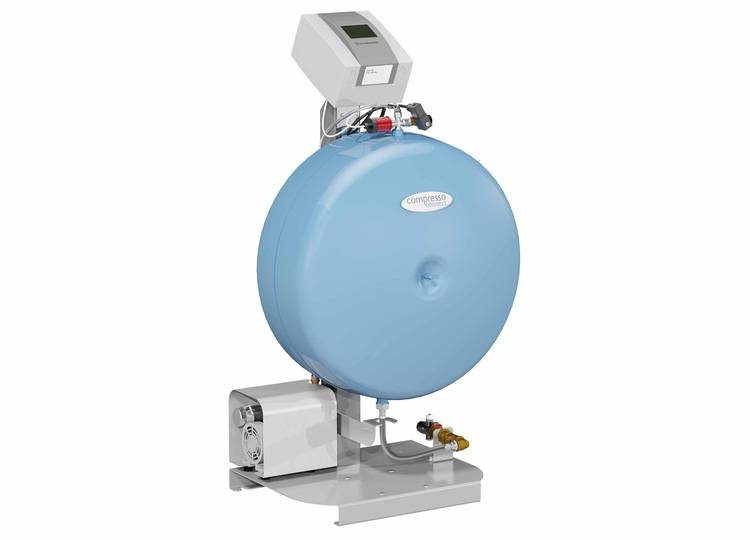 Innerhalb der Präzisionsdruckhaltung mit Kompressoren deckt die Neuheit den unteren Leistungsbereich ab. Gleichzeitig bietet sie eine Lösung für Kunden, die auch bei kleinen bis mittleren Heizungsanlagen von den Vorteilen einer modernen Kompressordruckhaltung profitieren möchten. Durch die natürliche Elastizität des Luftpolsters im Ausdehnungsgefäß wird der Druck bis auf ± 0,1 bar konstant gehalten. Selbst bei Stromausfall bleibt die Druckhaltestation weitestgehend arbeitsfähig. Das Nennvolumen der Gefäße kann dabei fast vollständig zur Wasseraufnahme genutzt werden.
