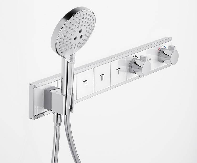 Drei Oberflächenvarianten stehen zur Wahl: Entweder mit weiß oder schwarz hinterlegtem Glas oder ganz traditionell mit chromfarbenem Metall. Die RainSelect Duschsteuerung lässt sich als komfortable Schaltzentrale für entspanntes Duschen unter anderem mit den Rainmaker Select Kopfbrausen kombinieren, die die Formensprache und Materialität wieder aufgreifen.