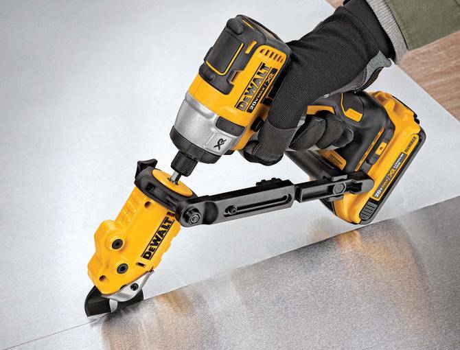 Der Blechscherenaufsatz DT70620 schneidet mühelos Blech bis zu einer Stärke von 1,3 mm sowie andere Metalle und ist mit Schlagschraubern aller Fabrikate kompatibel.