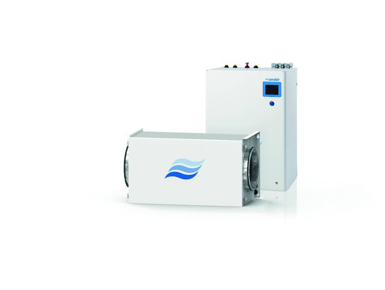Der Diffusionsluftbefeuchter von Condair besteht aus einer Befeuchtungsbox, die in die Zuluftleitung der kontrollierten Wohnraumlüftung integriert ist und einer Hydraulik-Einheit. Es bietet sich die Möglichkeit, das Gehäuse der Befeuchtungsbox auch als Vormontage-Leerteil zu nutzen, wodurch eine spätere Nachrüstung vereinfacht wird.