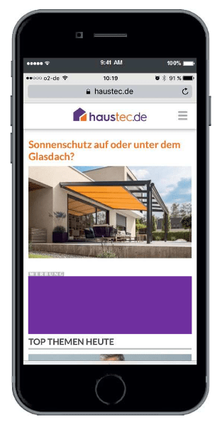 haustec.de verzeichnet durchschnittlich 40% mobilen Traffic. Seien Sie bei unseren Lesern ganz nah dran und buchen Sie das beliebte Mobile Medium Rectangle.