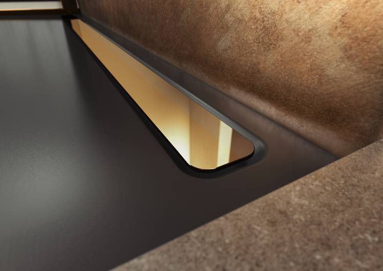 Ein charakteristisches Designmerkmal der Nexsys von Kaldewei ist ihre schlanke Ablaufrinne, die sich fast bündig in die emaillierte Duschfläche einfügt. Architekten und Bauherren können bei der Designblende aus fünf unterschiedlichen Ausführungen wählen. Neben Edelstahl gebürstet und Alpinweiß ziehen als Highlight mit Gold glänzend oder Rotgold gebürstet auch edle Metallakzente ins Bad ein.