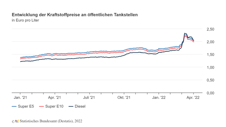 Die Benzin- und Dieselpreise an den deutschen Tankstellen blieben auch in der ersten Aprilwoche 2022 deutlich höher als vor dem Krieg in der Ukraine, wenngleich die Preise für Superbenzin der Sorte E5 und Diesel gegenüber ihren Höchstständen in der zweiten und dritten Märzwoche wieder gesunken sind. Am 10. März 2022 hatte E5 noch 2,26 Euro und Diesel 2,33 Euro pro Liter gekostet.