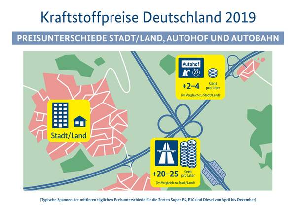 - Zwischen Stadt und Land sind die Preisunterschiede im Durchschnitt eher gering. An Autohöfen sind die Preise im Vergleich häufig etwas höher (+2-4 Cent/Liter). Wer an einer Autobahntankstelle tankt, muss mit ganz erheblich höheren Preisen rechnen (+20-25 Cent/Liter).